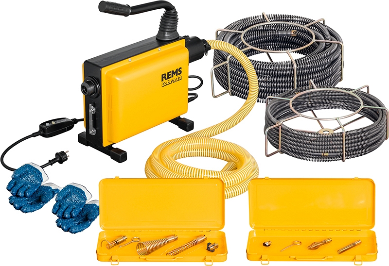 - Rems Кобра 22 Сет 16+22. Электрическая машина для прочистки труб Ø 20 – 150 мм. Приводной двигатель с не требующим технического обслуживания конденсаторным двигателем 230 В, 50 Гц, 750 Вт, правый и левый ход. Направляющая. Кабель со встроенным выключателем безопасности (PRCD). С комплектом спиралей и инструмента 16 мм: 5 частей спиралей 16 мм × 2,3 м в корзине, прямой бур 16 мм, бугорчатый бур 16 мм, зубчатый лепестковый бур 16/25 мм, разделительный штифт 16 мм, 1 пара перчаток, прочный стальной чемодан для насадок. С комплектом спиралей и инструмента 22 мм: 5 частей спиралей 22 мм × 4,5 м в корзине, прямой бур 22 мм, возвратный бур 22 мм, конусный бур 22 мм, зубчатый, лепестковый бур 22/35 мм, разделительный штифт 22/32 мм, 1 пара перчаток, прочный стальной чемодан для насадок. В коробке.